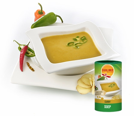 Sublimix currysoep/-saus Ideaal om de hartige eetlust te stillen:los een eetlepel currysoep/-saus op in een koffietas roeren,Klaar! U wilt een sausje bij kip en rijst,maak dan een een currysausje met de Sublimix currysoep/-saus.